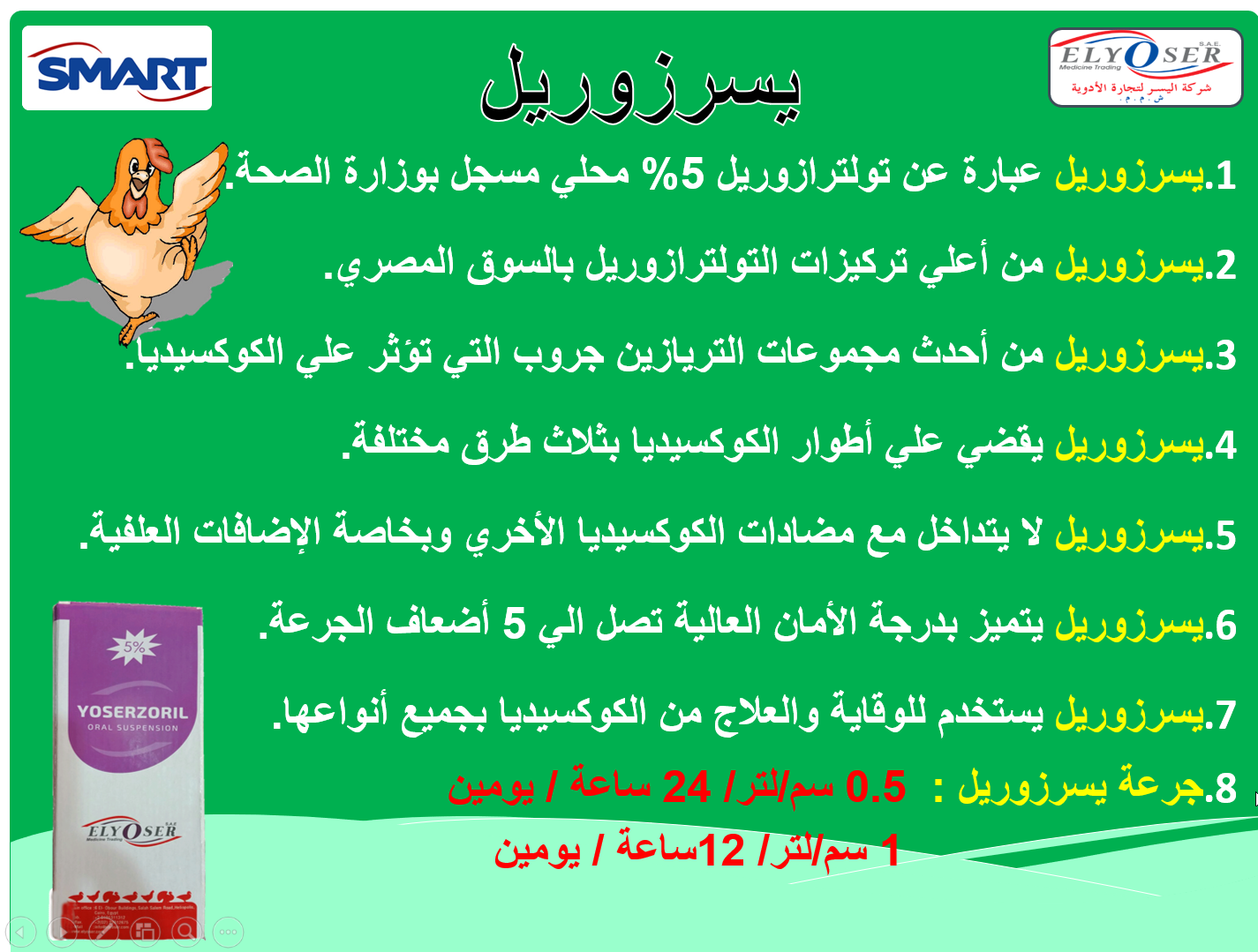 Yoserzuril 5 % used for prevention and treatment of Coccidia in poultry